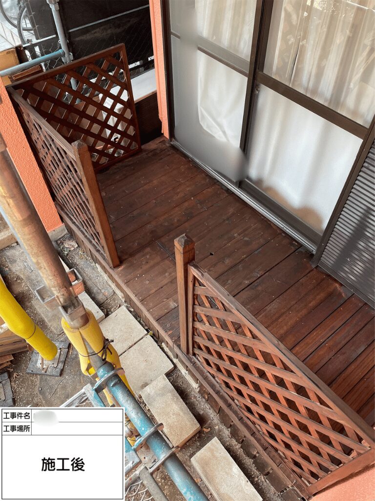 瓦屋根は漆喰の欠けが見られたため、補修と部分的な塗り直しを行い、雨水の侵入を防止。木部デッキには防腐剤を塗布し、表面のひび割れを補修して再塗装。物置や濡れ縁も併せて施工し、住まい全体を丁寧に整えました。
