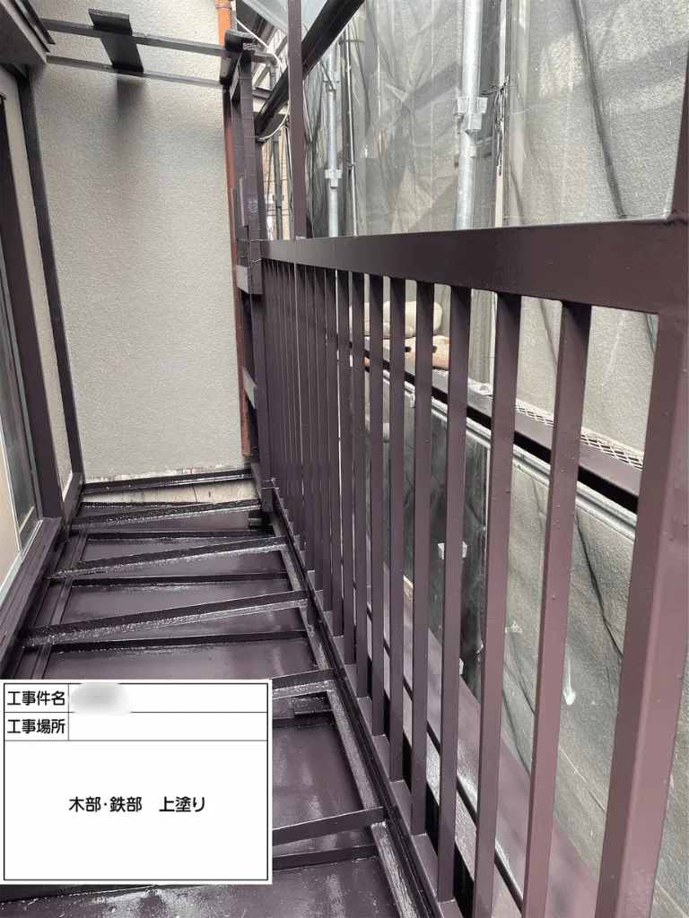 バルコニー床改修工事(木製床撤去・新設、防腐処理、塗装仕上げ)。