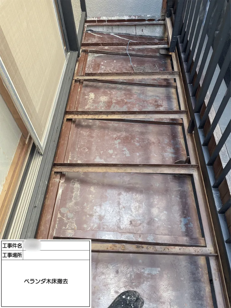 築35年を迎えたS様邸では、バルコニー床が木製のため紫外線や雨の影響で劣化が進行していました。特に一部は踏むと沈み込むほど傷んでおり、安全面で不安がある状態でした。