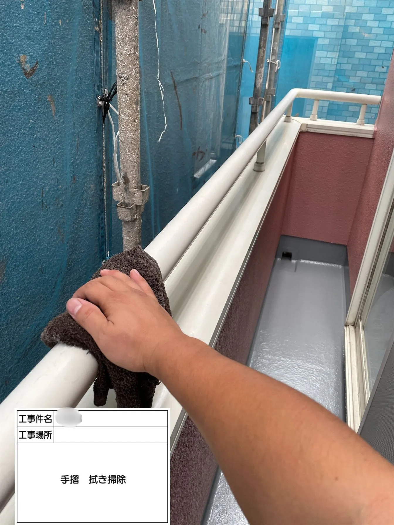 鉄部のサビは放置すると再発しやすいため、ケレン(手作業でのサビ除去)と防錆下塗りを丁寧に行いました。仕上がりはグレージュの上品な色合いがやわらかく光を反射し、落ち着いた印象に。H様にも大変ご満足いただけました。